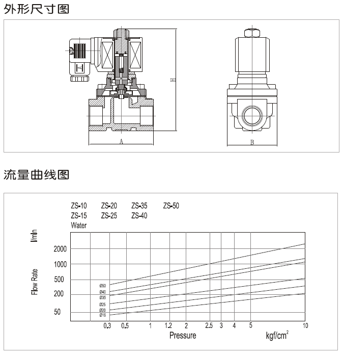 ZS二位二通大口径直动式(铜)电磁阀<常闭型> 二位二通常闭型电磁阀,断电关闭,通电打开;产品为系列化生产,体积小,流量大,适用范围广 阀体材质为:锻铜,铸铜(只限 32、40、50) 环境温度:0℃~65℃ 介质温度: 0℃~120℃ 安装:按阀上所标流向箭头,为增强使用寿命和可靠性,最好线圈向上,水平安装 电压:AC24V/110V/220V/230V/240V 50/60HZ DC24V/12V ±10%允许波动 16~25mm可选配德国NASS线圈 密封件:可采用NBR、VITON、EPDM等多种,以适用于不同流体的开关控制. 11)ZS铜系列大口径直动式电磁阀〈常闭型〉 型号规格